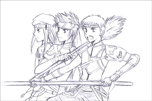 とうとう最終戦へやってきました。 マリカまで描けませんでした・・・ 色塗りも無理でした・・・・・ 因みに今現在本当に持ってる武器は、団長は剣。ジェイルは拳。リウはやっぱりホウキ(笑)