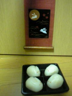 掛け軸はこの間の夏コミで、ゲットした漆板のお月見うさぎです。